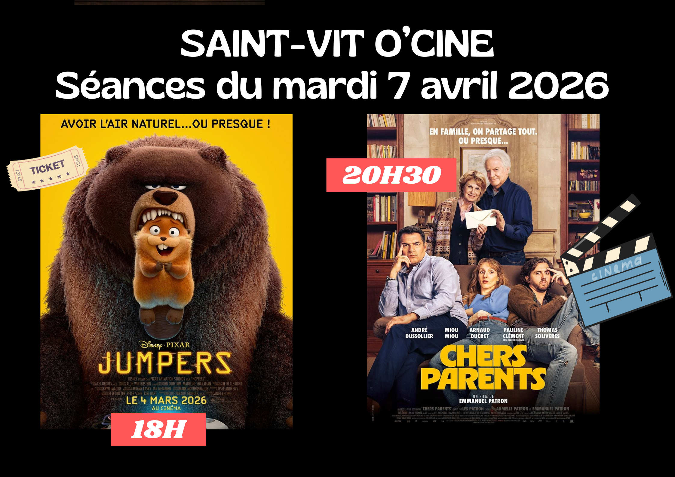 Les deux séances du mardi 7 avril 2026 Tarif plein : 6€ / Tarif réduit : 4,50 €. Salle des fêtes – promenade des Planches.18H : JUMPERSDurée : 1h45 min […]